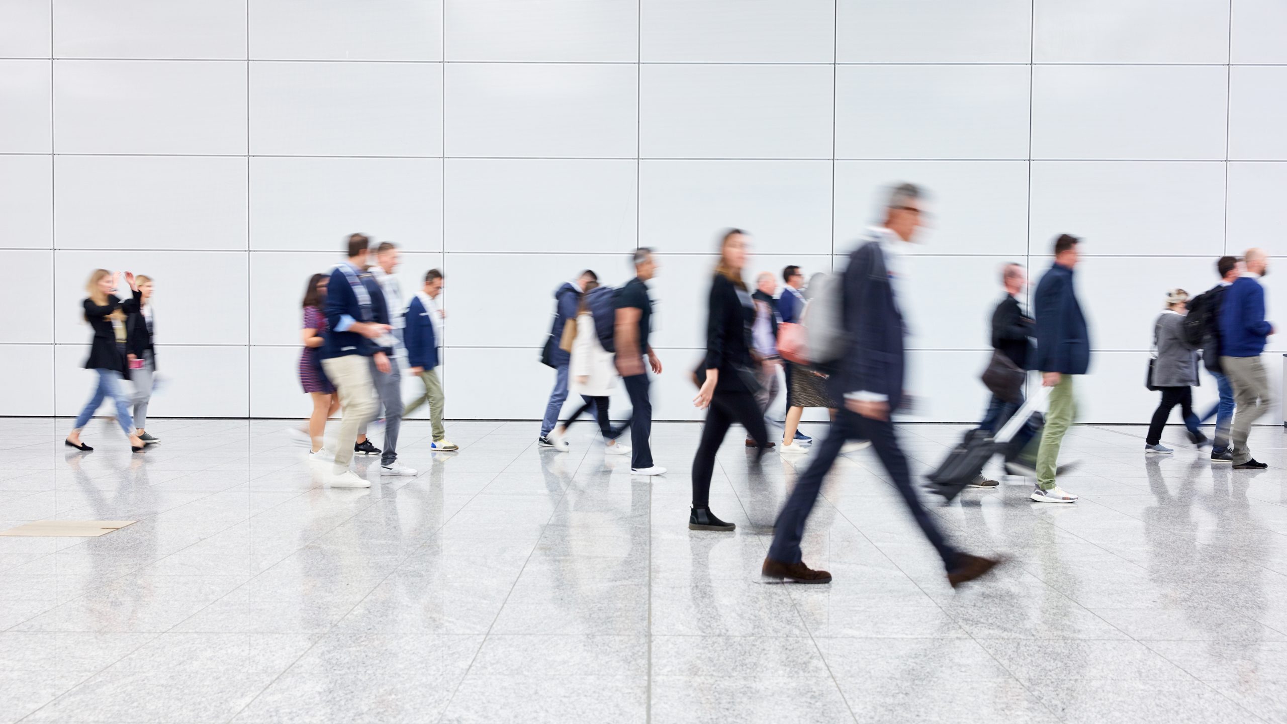 Anonyme Menschenmenge geht durch Gang auf Messe oder Flughafen