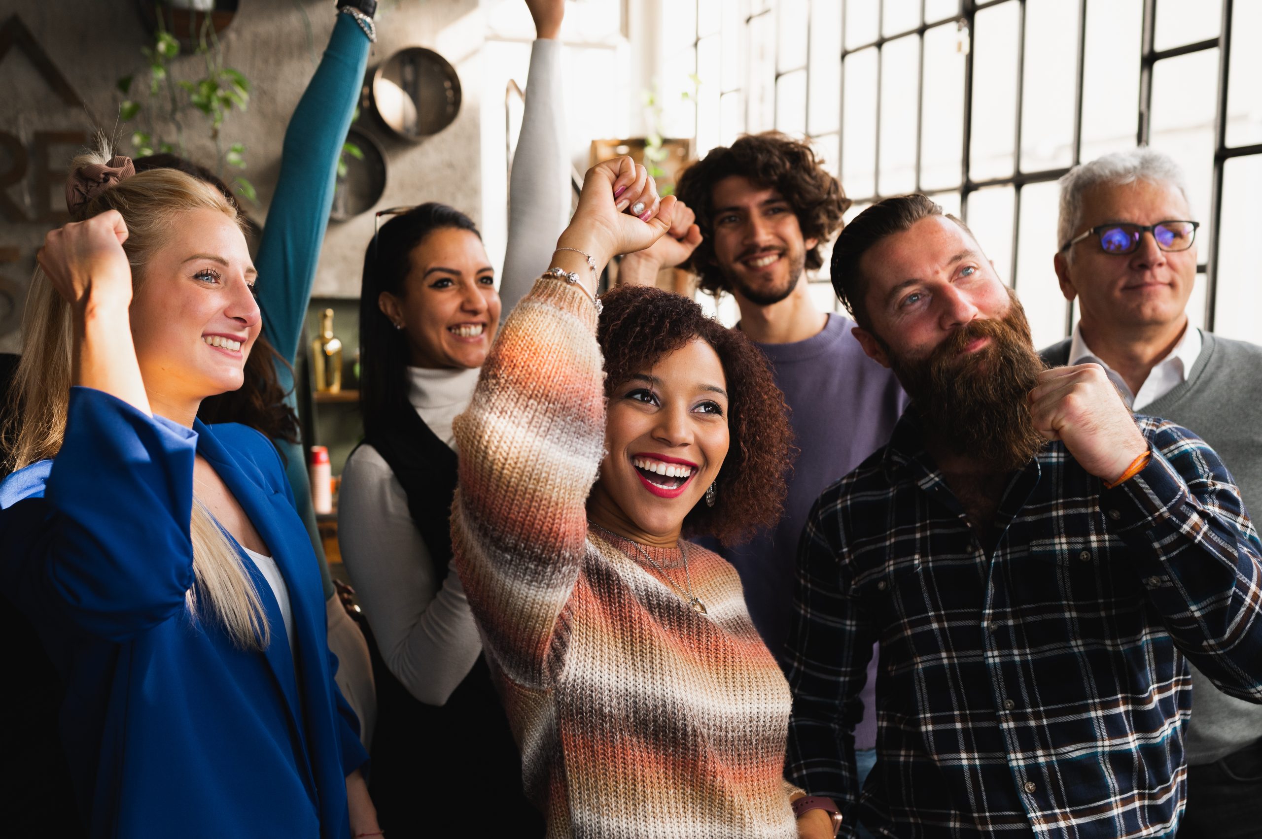 Multiracial group of casual people exulting.