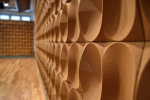 The room walls are equipped with brown sound-absorbing panels. Made from natural materials It has the shape of a circular pattern.