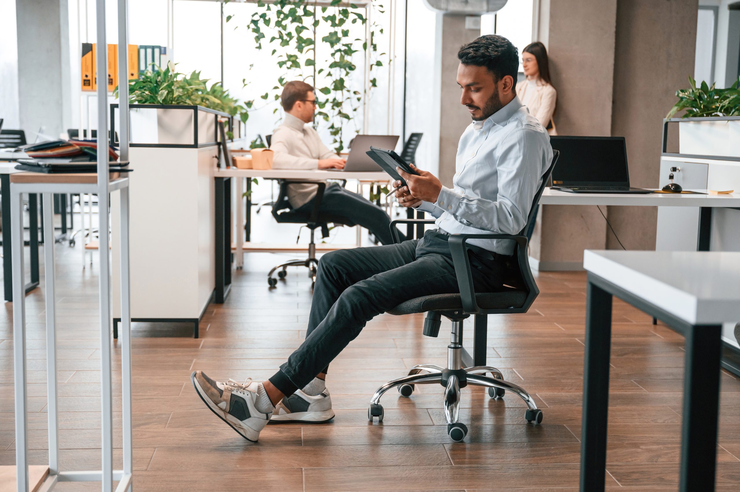 Talking behind the person that is sitting on the chair with digital device. Men and woman are working in the office together.