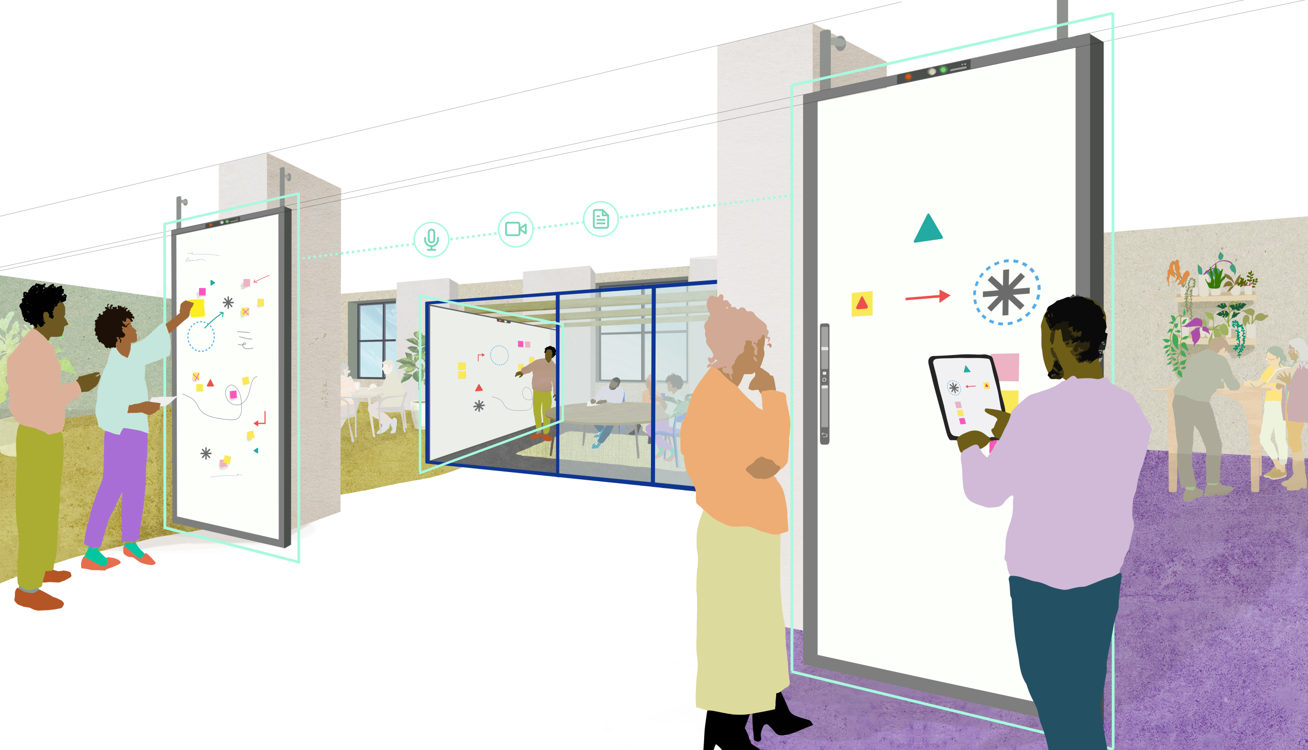Featured Image: The Sprint Studio’s fully integrated, ambient technology assists teams as they clarify their ideas. Audio recording and visual note capture eliminate the tedious steps in a collaborative creative process, allowing participants to focus on what they do best.