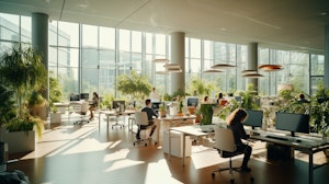 Vibrant open space office filled with natural light and bustling with productivity