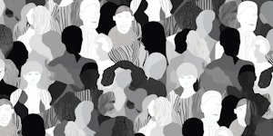 Gray scale diverse people crowd abstract art seamless pattern. Multi-ethnic person gray color community team, retro cultural diversity group background illustration in black and, Generative AI